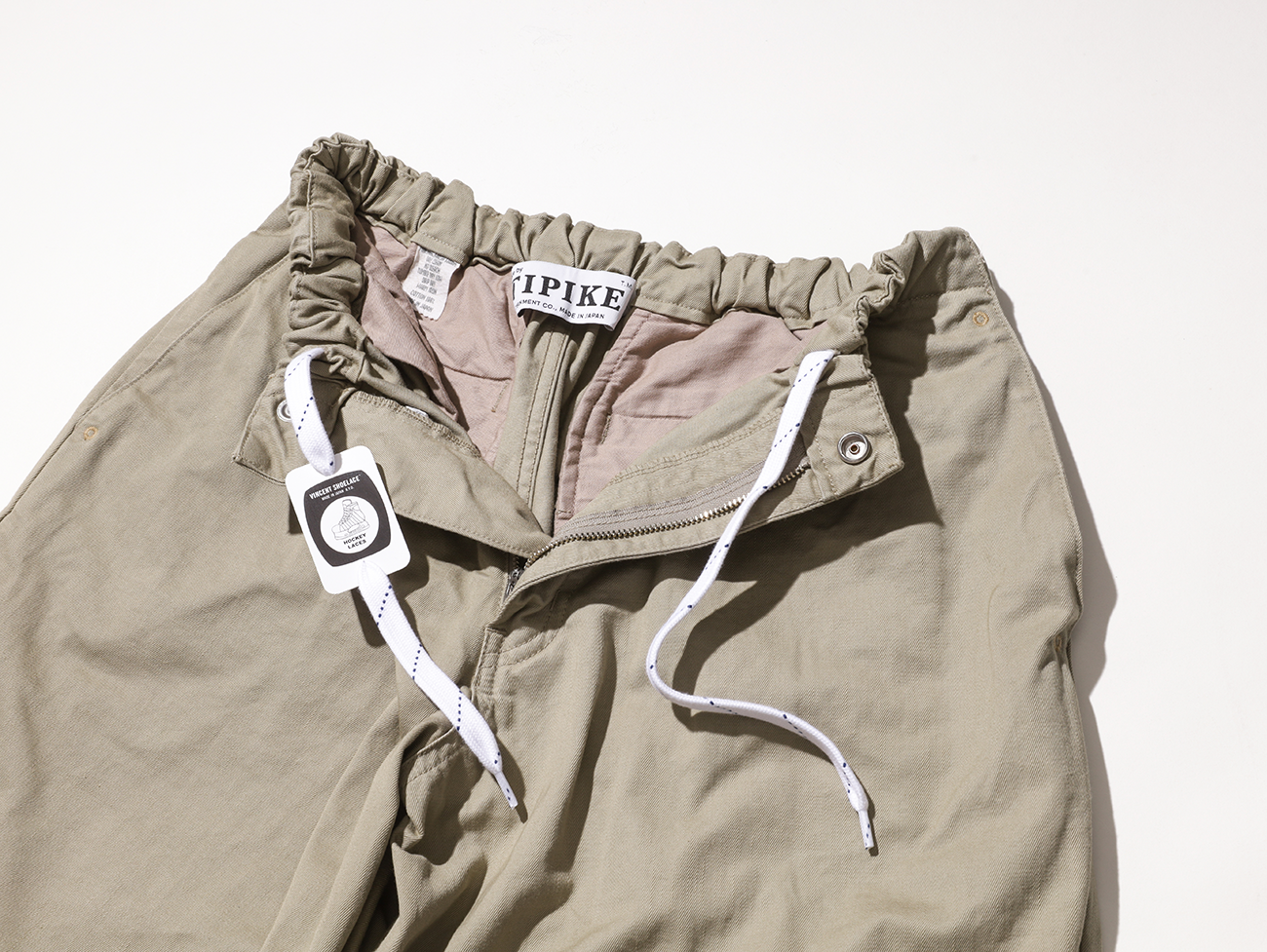 スタンダードというものを目指しパターンや素材、縫製を研究して作成したイージーパンツ。80s〜90sにアメリカでサーファーやスケートボードをする若者が当時履いていたパンツをベースにシルエットや仕様を再構築しました。フロント部分はオープンボタンと金属ファスナー使用になっています。ウエスト部分にはゴムが入っていて、内側のコードを縛って体にぴったりに調整する事ができます。毎日はいていても飽きのこないシンプルで履きやすいスタンダードなパンツです。