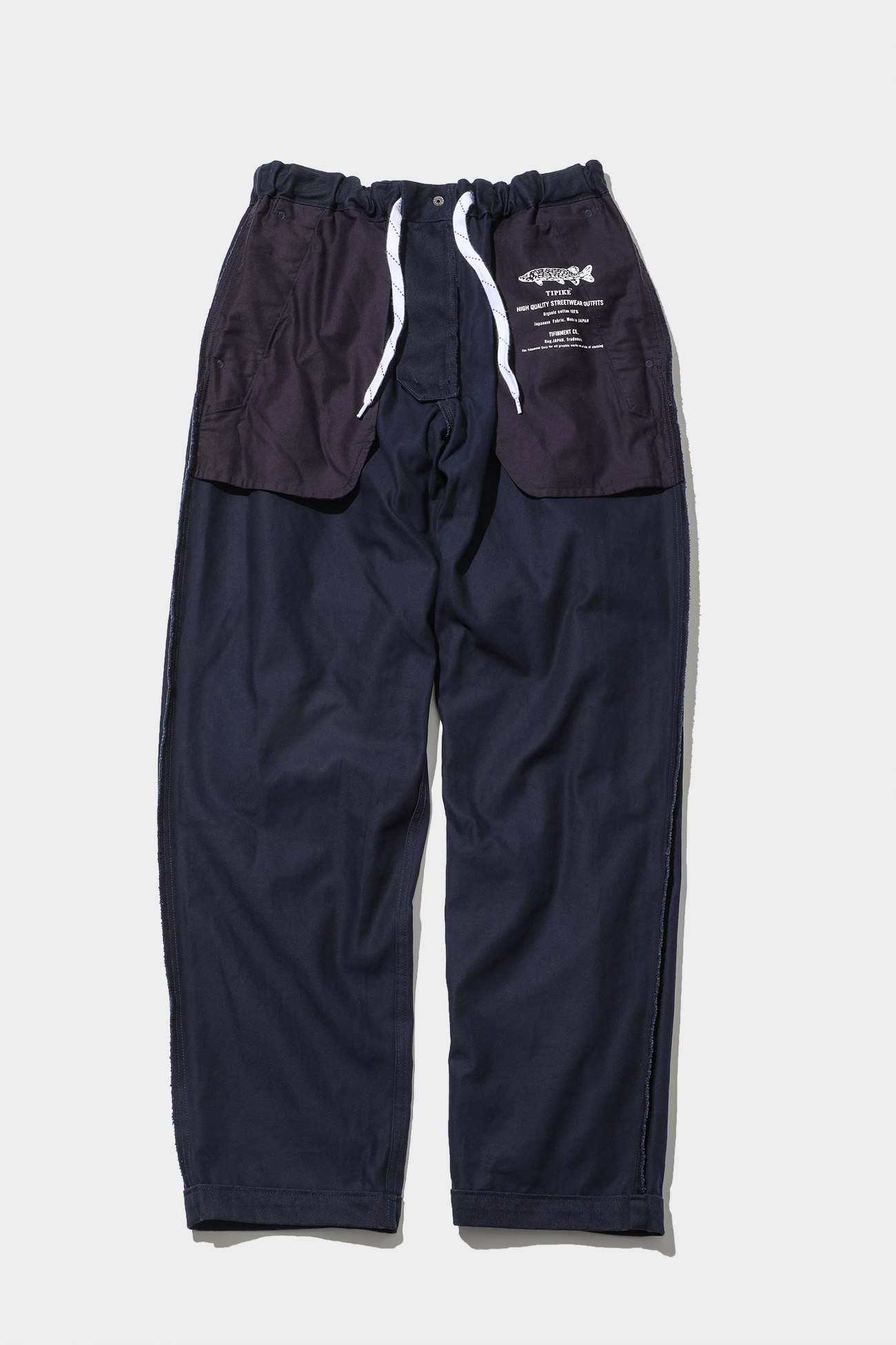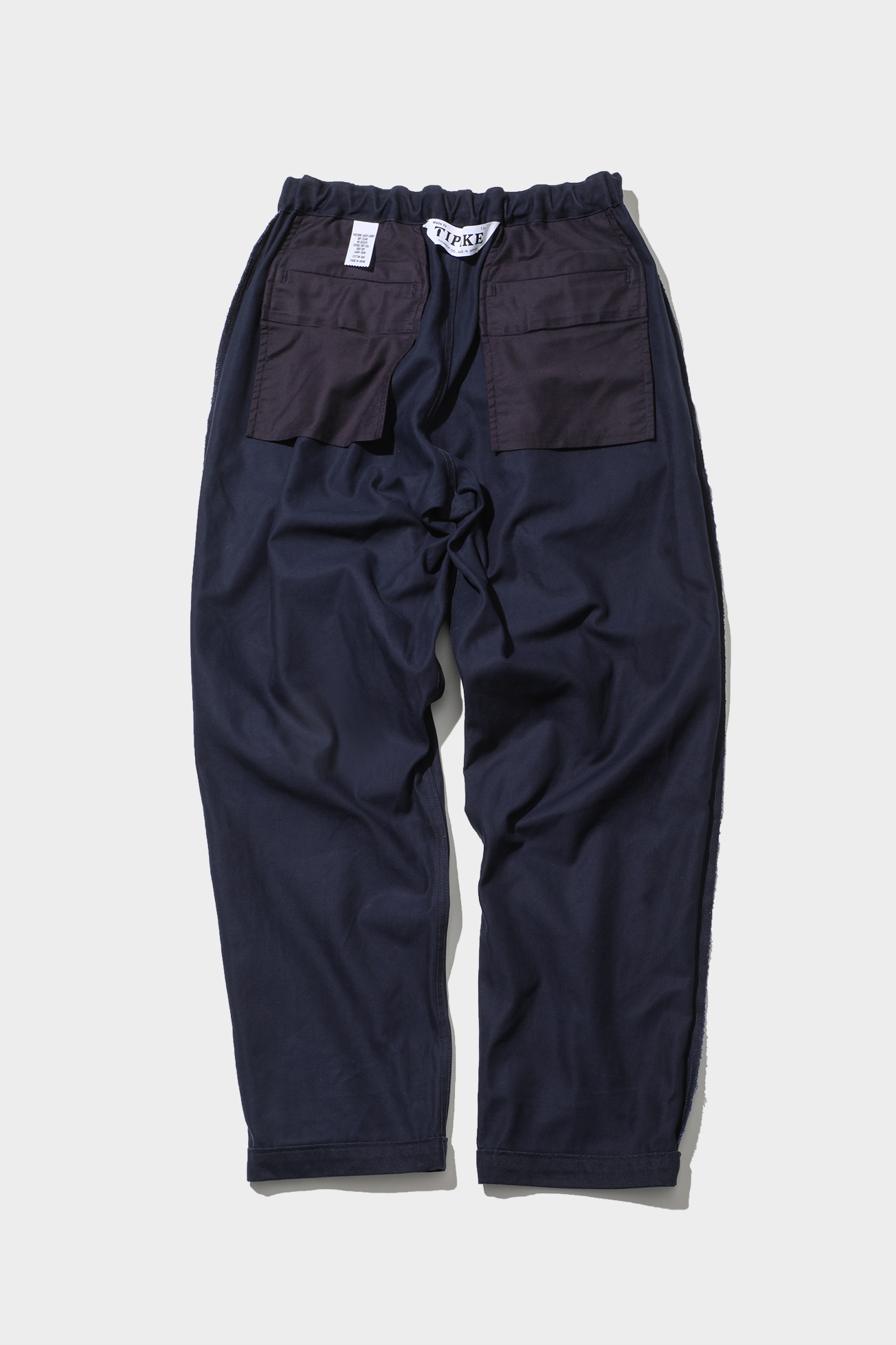 スタンダードというものを目指しパターンや素材、縫製を研究して作成したイージーパンツ。80s〜90sにアメリカでサーファーやスケートボードをする若者が当時履いていたパンツをベースにシルエットや仕様を再構築しました。フロント部分はオープンボタンと金属ファスナー使用になっています。ウエスト部分にはゴムが入っていて、内側のコードを縛って体にぴったりに調整する事ができます。毎日はいていても飽きのこないシンプルで履きやすいスタンダードなパンツです。